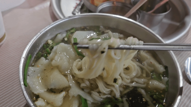 넙적한 수제비를 호록 마셔버리는 재미.